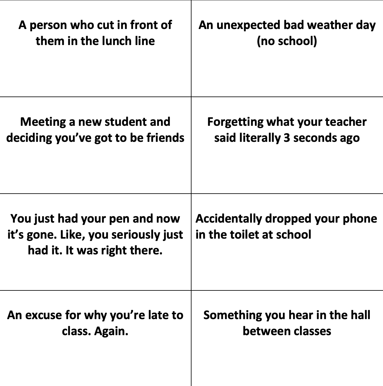 ✅Flip through the novels to find a line of dialogue that humorously, nonsensically “matches” the scenario from the quote card.