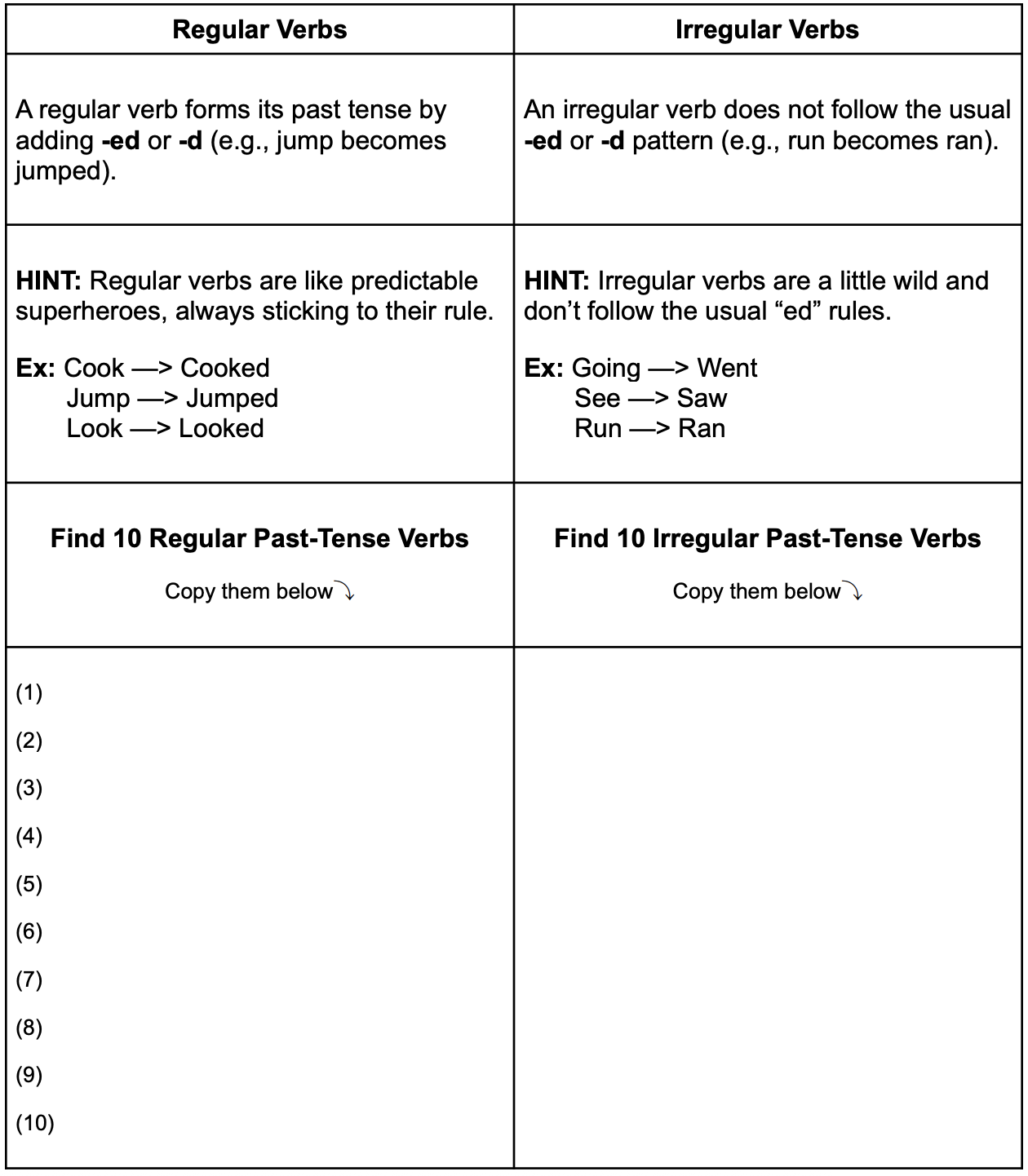 - Pay attention to the PAST TENSE VERBS → Action words that show something happened in the past Happy verb hunting!