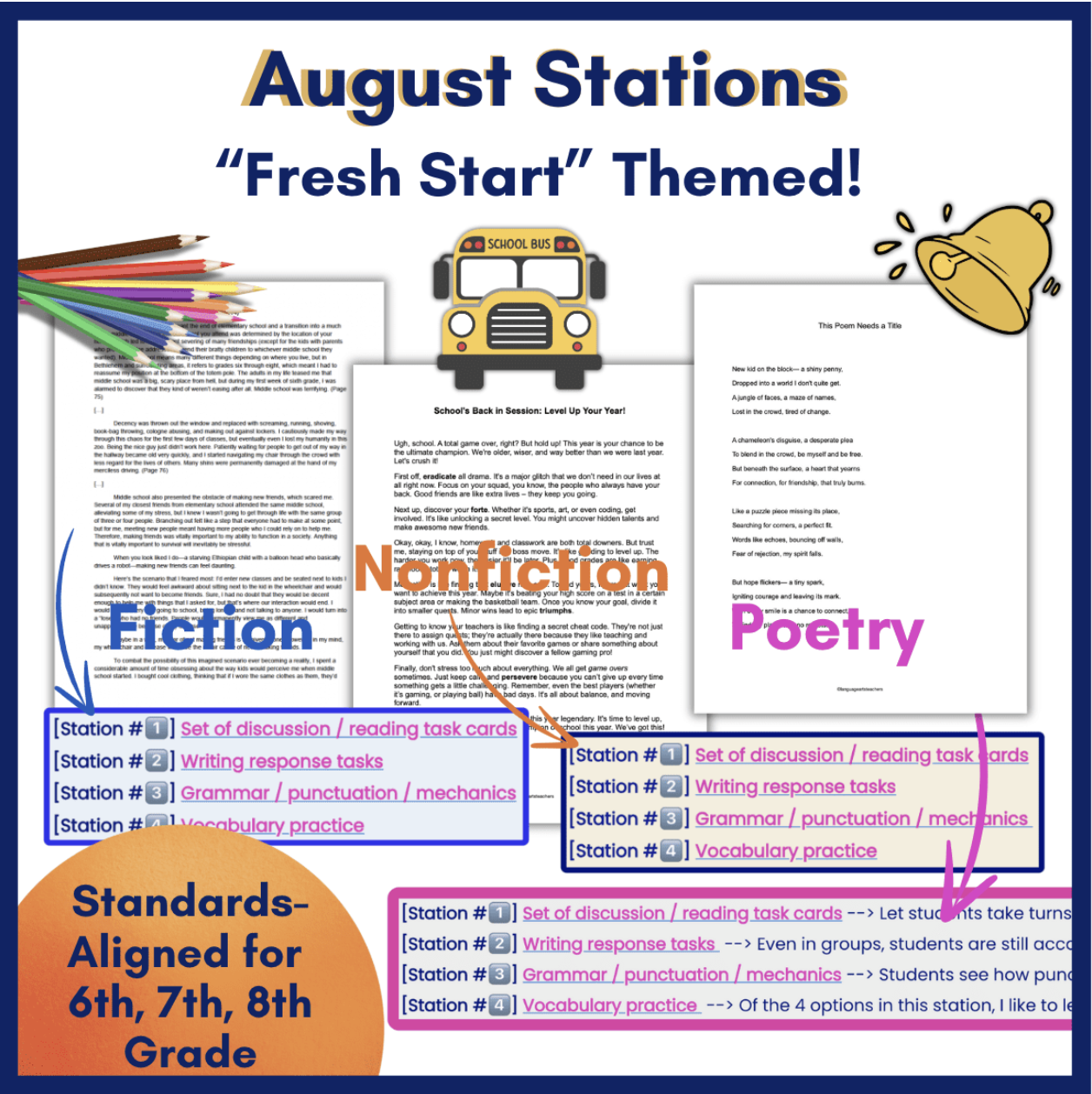 The beginning of the school year brings with it that “fresh start – fitting in” vibe. We’ll capitalize on that by bringing in three reading pieces that are thematically tied to that exact topic: A fiction piece, a nonfiction piece, and a poem that helps students see that starting over and fitting in are common elements we all endure as part of our human experience—in real life and in literature.