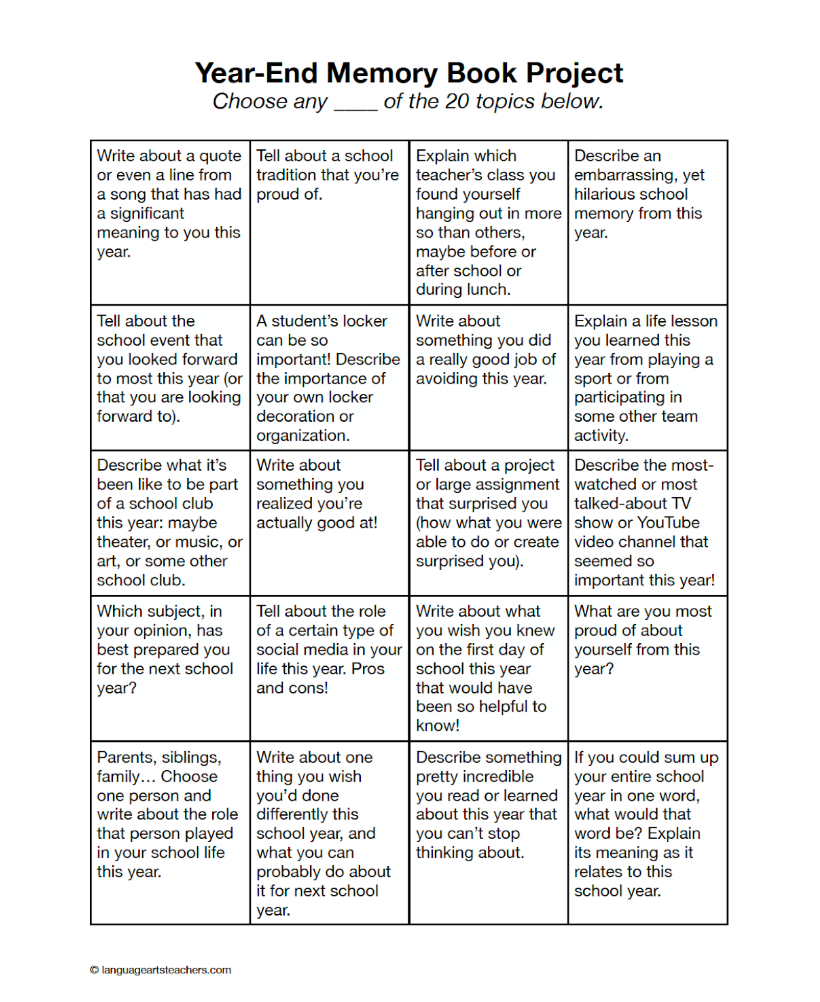 1) Your memory book will be compiled of _____ reflection topics you choose to write about based on this particular school year as it comes to a close. There are 20 topics to choose from.